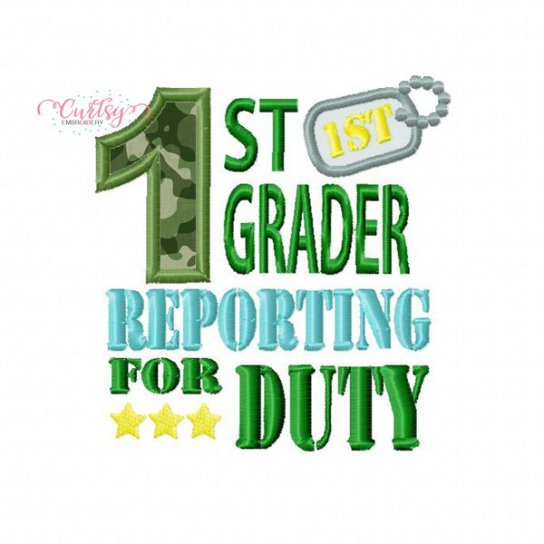 Tags: 1st grade applique, 1st grade embroidery, 1st grader reporting for duty, applique, applique design, back to school embroidery, embroidery applique, embroidery design, first day of school embroidery design, machine embroidery, school applique, school shirt embroidery