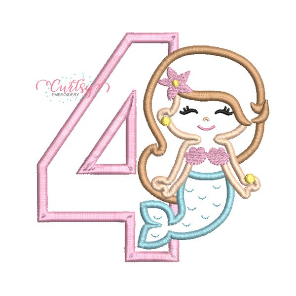 4th Birthday Cute Mermaid Embroidery Applique Design